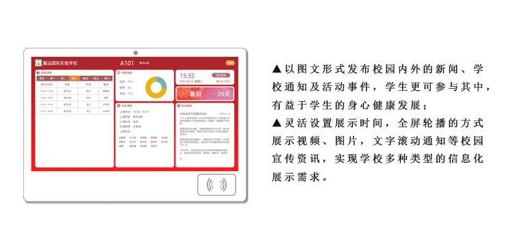 智慧班牌是智慧校園建設不斷發展的產物,是教育信息化改革的部分體現。它針對教改需求和學校使用場景的綜合考慮融合了教學需求的方方面面,加入了更多的實用功能,讓班牌更加靈活豐富。智慧班牌是以云平臺、云服務器為基礎,采用區域實施管理,實現大數據、資源共享,有利于學校信息化建設和交流,也更易操作管理、數據更安全可靠,有效降低學校使用成本;平臺系統不斷優化升級,版本升級云端控制,更貼合學校教育改革需求。